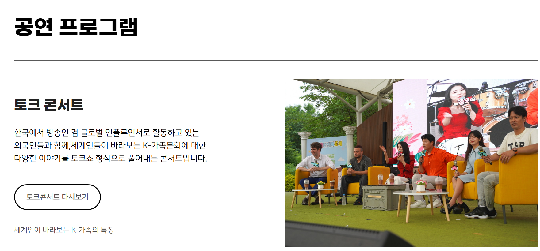 - 주요 프로그램: 토크콘서트, 가족 노래 경연, 전통 혼례 퍼포먼스, 다양한 체험 부스 등.