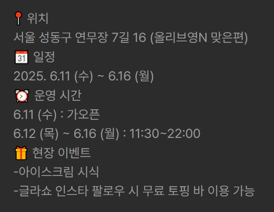 글라소 팝업 스토어는 서울 성동구 연무장7길 16 (올리브영N 맞은편)에서 진행돼요. 일정은 2025년 6월 11일(수)부터 6월 16일(월)까지로, 딱 6일간만 열린다고 하니 서둘러야겠죠? 운영 시간은 월~일요일 모두 오전 11시 30분부터 오후 10시까지로 아주 넉넉하답니다. 저녁에도 시원하게 아이스크림을 즐길 수 있어서 너무 좋네요!