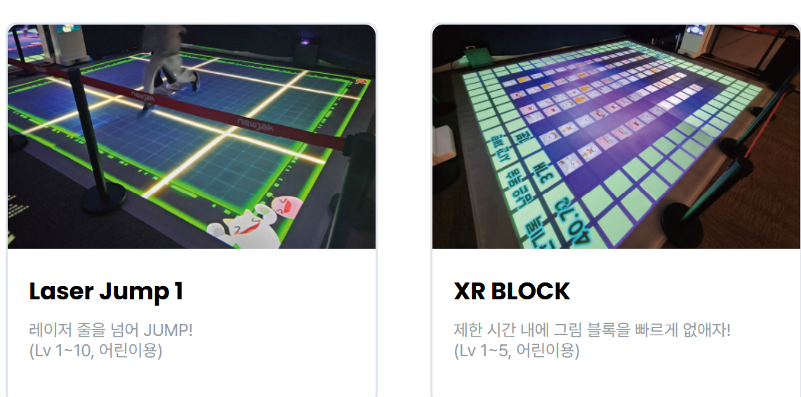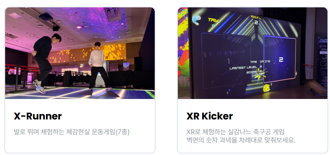 - 'X-RUNNER' 같은 체감형 운동 게임, 'AI Zone'의 인공지능 창작 체험, 'XR Sport Zone'의 실감나는 스포츠 게임 등 11가지 다양한 콘텐츠를 즐길 수 있어요.
