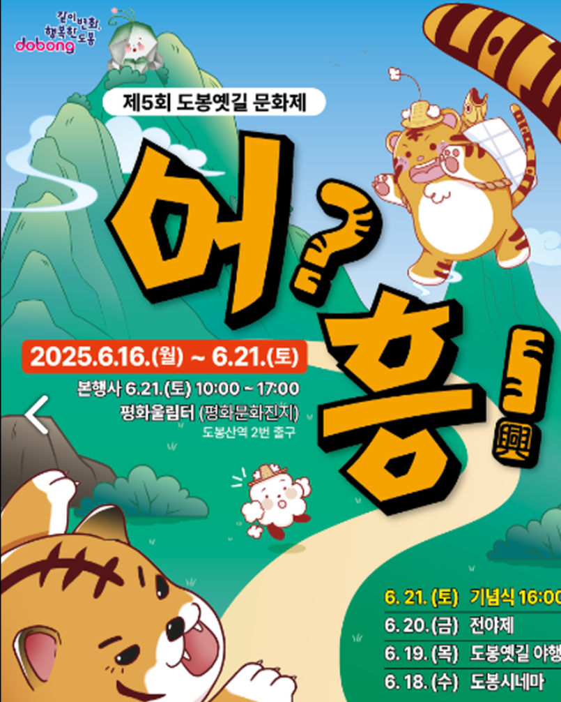 특히 이번 제5회 도봉옛길 문화제는 "어? 흥(興)!"이라는 재미있는 주제를 가지고 있더라고요. 예로부터 풍요와 벽사의 상징이었던 호랑이, 그리고 축제의 마스코트인 '패랑이'와 호랑이 울음소리를 연계해서 지역 주민들의 액운을 물리치고 활기찬 메시지를 전달한다고 해요. 이름만 들어도 벌써부터 신나지 않나요? 🐯
