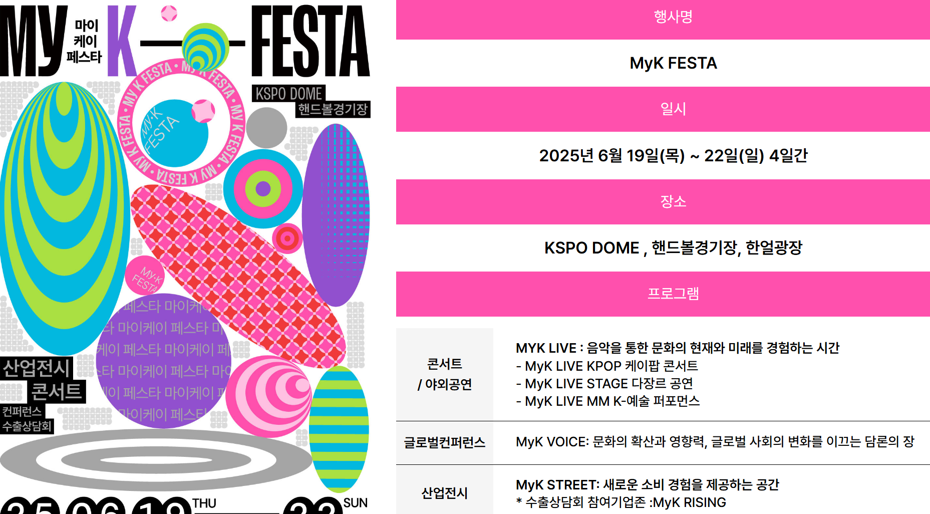 - MyK FESTA는 K-POP 콘서트, 컨퍼런스, 산업 전시 등 K-컬처 전반을 아우르는 대규모 축제예요.